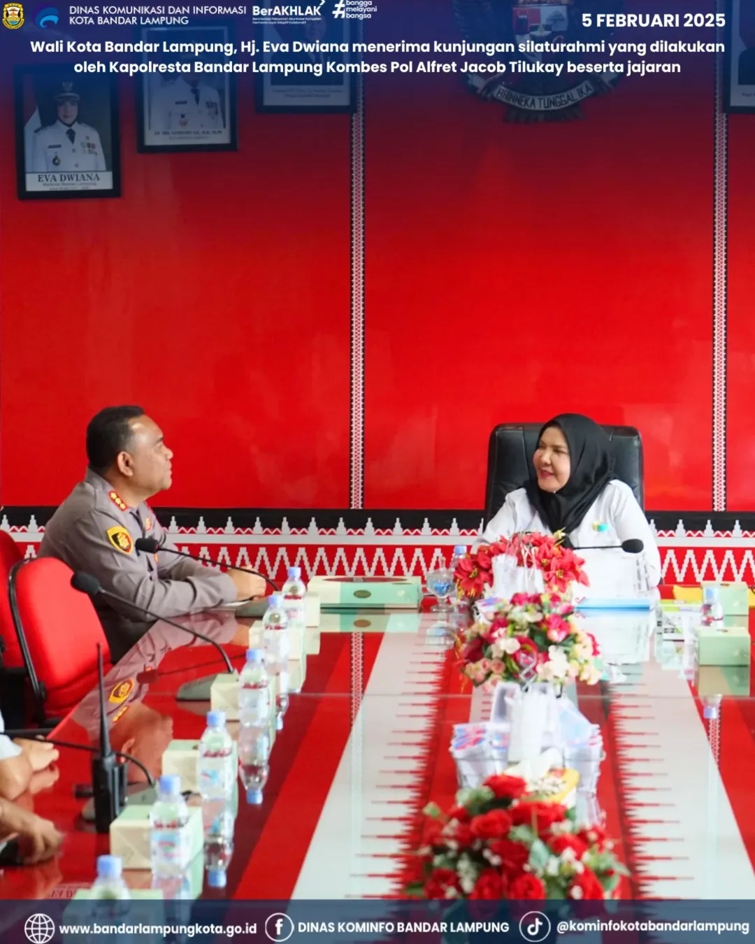 Walikota Bandar Lampung, Hj. Eva Dwiana menerima kunjungan silaturahmi yang dilakukan oleh Kapolresta Bandar Lampung Kombes Pol Alfret Jacob Tilukay beserta jajaran pada Rabu, 5 Februari 2025.