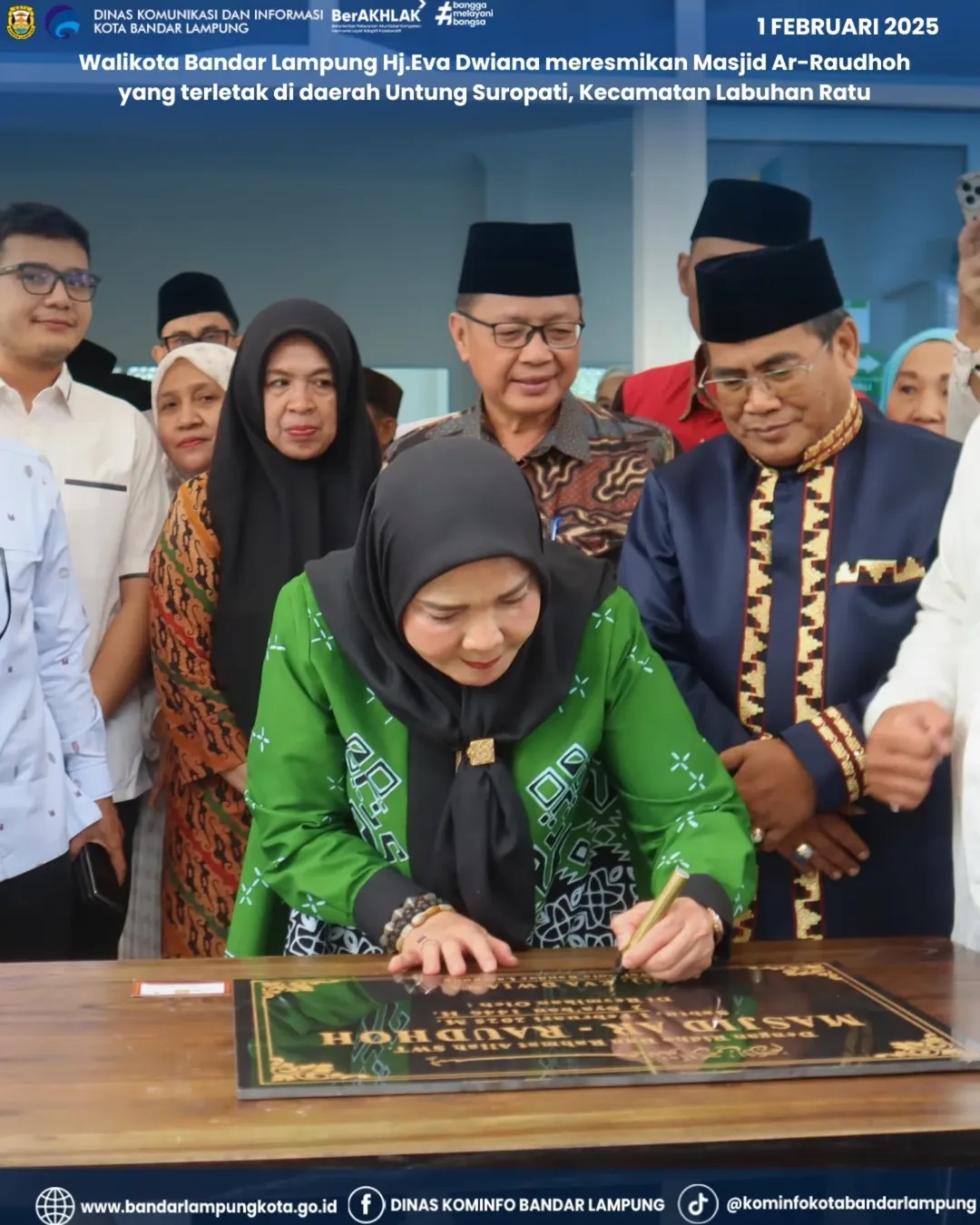 Walikota Bandar Lampung Hj.Eva Dwiana meresmikan Masjid Ar-Raudhoh yang terletak di daerah Untung Suropati, Kecamatan Labuhan Ratu, Sabtu (1/2/2025).